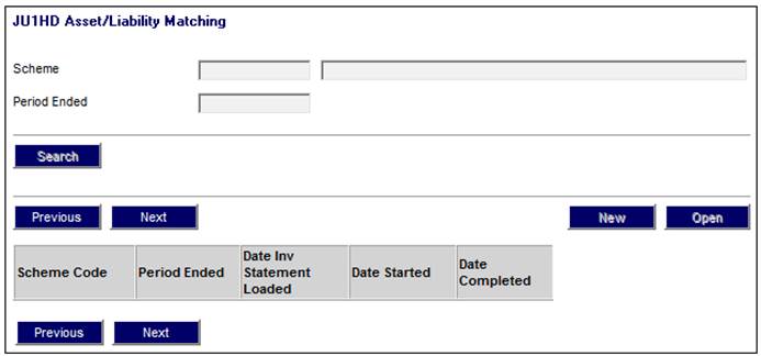 Select Asset/Liability Matching from the menu at the top.  The JU1HD Asset/Liability Matching screen will be displayed.