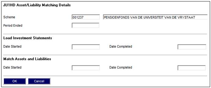 To display an asset/liability matching record for a particular period for a scheme, capture a scheme code in the Scheme field and a financial period in the Period Ended field.  ClickSEARCH