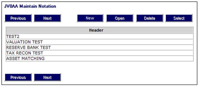 To display an existing set of financial statement details, highlight a financial statement on the JU1HD Asset/Liability Matching screen and click OPEN.