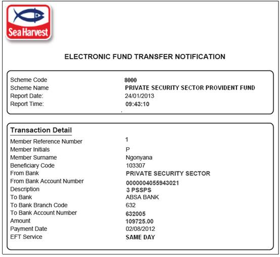 A list of the EFT transactions uploaded can be displayed with a hyperlink for each transaction.  When the hyperlink is selected, a document in PDF format is created and displayed with the details of the transaction.