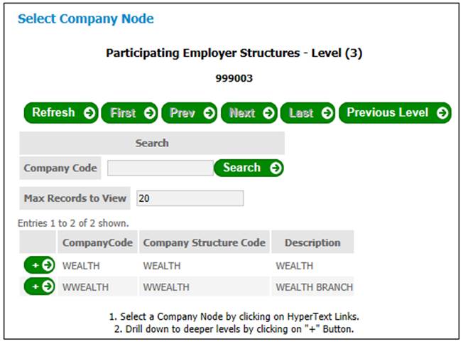 The Select Company Node Participating Employer Structures - Level (3) screen will be displayed (level 3 is the company branch).