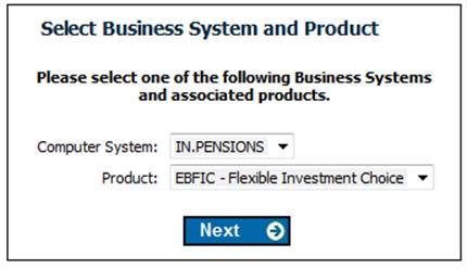 Select Client Administration > Pay Centre Reference Numbers. The Select Business System and Product screen is displayed.