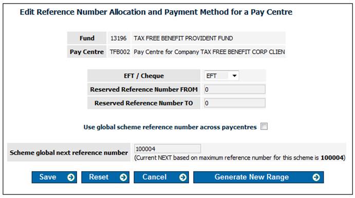 To define a range of reference numbers for the Pay Centre, select Client Administration > Pay Centre Reference Numbers.