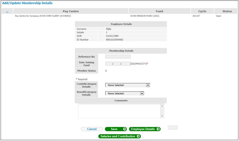 This screen displays the employee details, and additional membership fields will be displayed for completion.