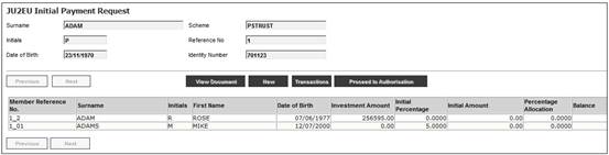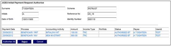 If initial payments have been captured for any of the Beneficiaries, the details of the transactions will be displayed. The system will retrieve the BT’s with the following Accounting Activities on the Pre-authorised BT table for each Beneficiary: