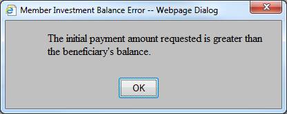 The system will retrieve the balance on the Beneficiary’s INVESTMEMB account and check that the Amount captured is not greater than the balance retrieved. If it is, the following error message will be displayed: