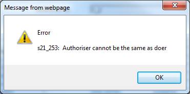 If the authorising user is the same as the user who created the initial payment, the following error message will be displayed: