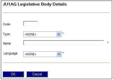 Flows to the dialogue box New Legislative Body to add a legislative body record. |