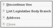 From the JU1AG Legislative Body List screen, highlight a Legislative Body and select Address from the sub-menu on the left.