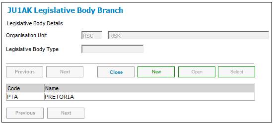 To add a new legislative body branch, click NEW. The JU1AK Legislative Body screen will be displayed.