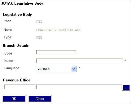 Flows to the dialogue box Legislative Body Branch Details to update or display the legislative body branch record. |
