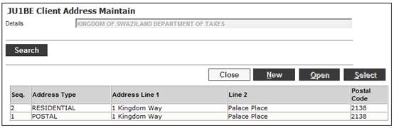Select an address type from the drop-down list and click OK. If the address type exists, then the system will display it on the JU1BE Client Address Maintain screen.