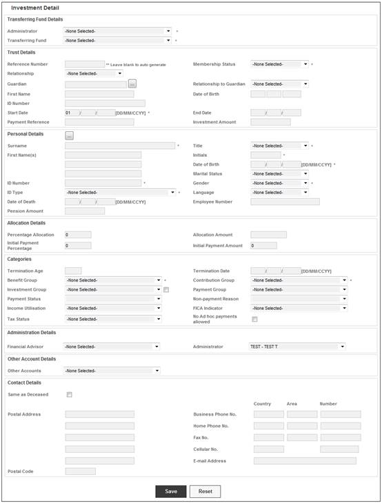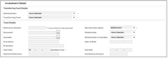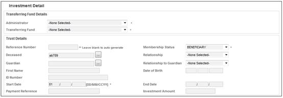 The Reference Number of the deceased member selected will be displayed in the Deceased field on the Investment Detail screen.