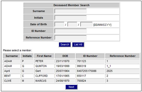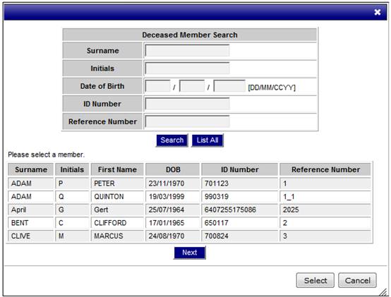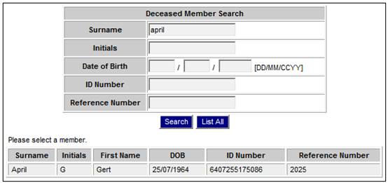The deceased members matching the search criteria will be displayed in the lower half of the screen.