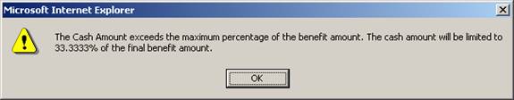 The percentage of the benefit that may be commuted for cash. Note: Per legislation, for pension funds a maximum cash percentage of 33.3333 applies. If the cash percentage exceeds the specified maximum, the following error message will be displayed: |