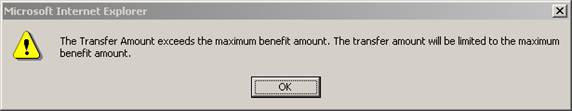 The amount to be transferred to another financial institution during the benefit payment process. Note: If a transfer amount is captured, and the maximum cash percentage (refer to the batch parameter for COMMUTATION) is less than 100, the system will calculate the amount captured as a percentage of the benefit amount. If the value of the cash or transfer amount exceeds the benefit amount, the following warning message will be displayed: |