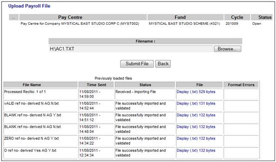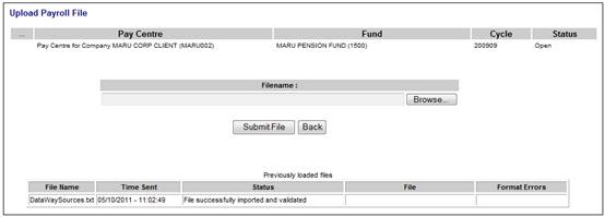 Once the file has been processed, the Upload Payroll File screen will display the message File successfully imported and validated in the Status column.