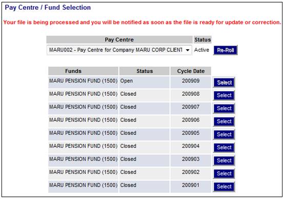 The Pay Centre / Fund Selection screen will be displayed with the message:
