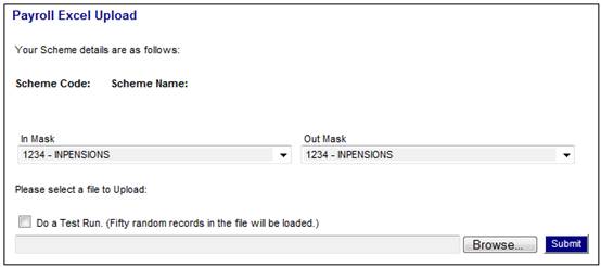 When SUBMIT is selected, the In Mask selected will convert the excel data selected for upload to the required txt format using the Out Mask selected.