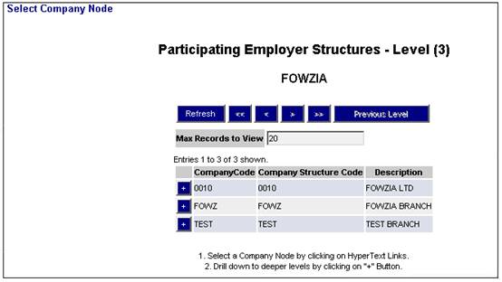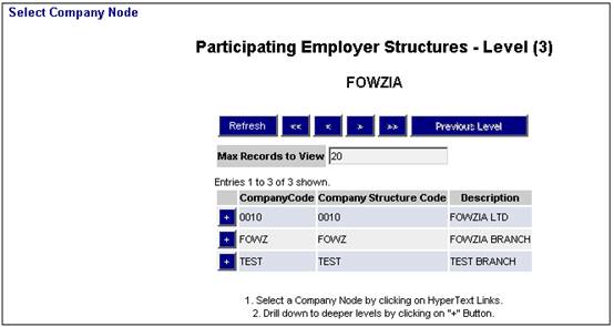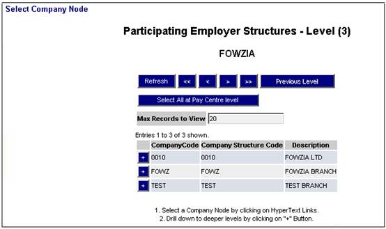 To add a new employee, from the Data Capture menu, select New Employee from the sub-menu on the left. The Select Company Node Participating Employer Structures - Level (3) screen will be displayed (level 3 is the company branch).