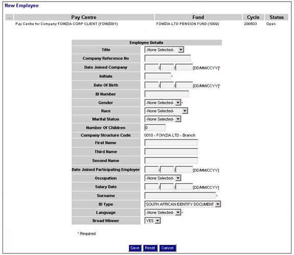 The New Employee screen for the selected pay centre will be displayed.