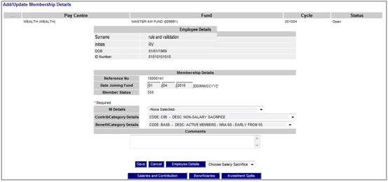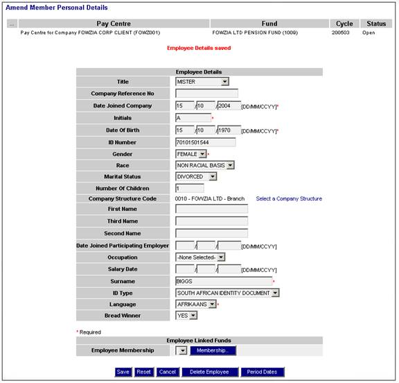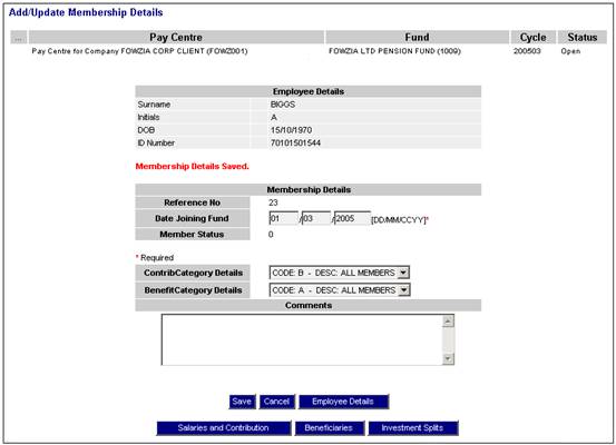 This screen displays the employee details, and additional membership fields will be displayed for completion.