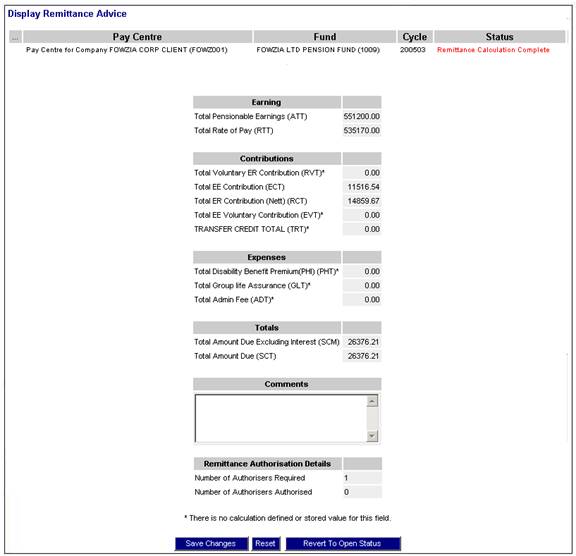 You can view the details displayed and see if the overall value adds up to the contribution amount received on the contribution schedule. You can decide whether to redo the remittance advice or to accept it. If the remittance advice is to be redone, click REVERT TO OPEN STATUS.