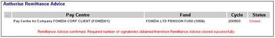 Click Authorise Remittance Advice below Remittance. The Authorise Remittance Advice screen will be displayed.