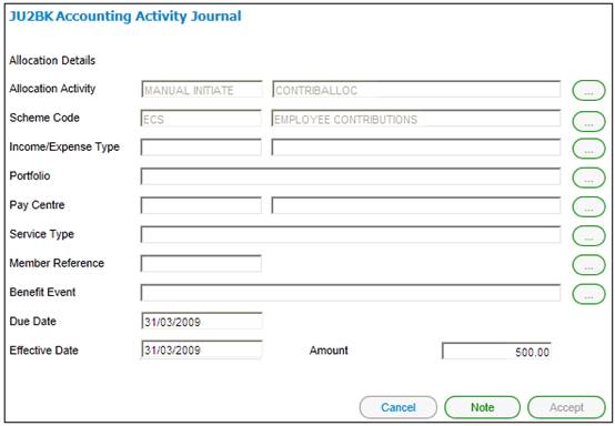To add an allocation split, click NEW. The JU2BK Accounting Activity Journal screen will be displayed.
