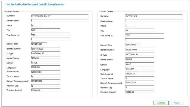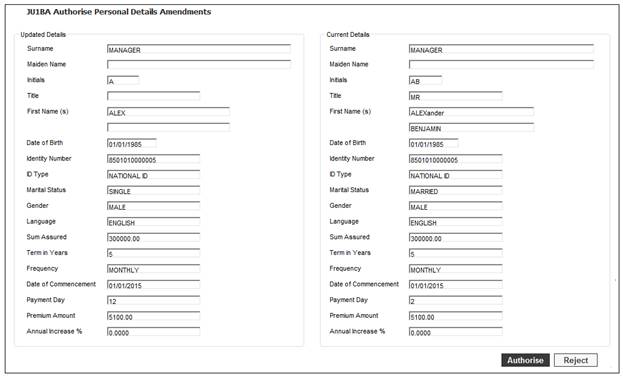 When the Service Request with a Process of POLICY CHANGES and an Activity of AUTHORISE POLICYHOLDER DETAILS is processed, the system will flow to the Authorise Personal Details Amendments screen and display the current value for all of the fields displayed and the value of the field after the update i.e. display the values for all of the fields and not just the value that has been updated.