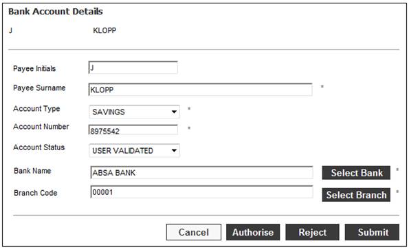 When a Service Request with a Process of POLICY CHANGES and Activity Name of AUTHORISE BANK DETAILS is processed, the system will flow to the Bank Account Details screen.