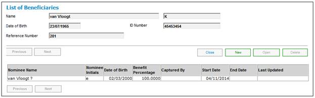 When a Beneficiary is selected and then the OPEN button is selected, the List of Beneficiaries screen is displayed.