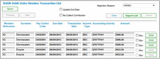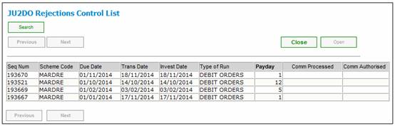 Under the Accounting functionality, when the Debit Order Rejections option is selected under the Transaction Capture menu, the JU2DO Rejections Control List screen is displayed.