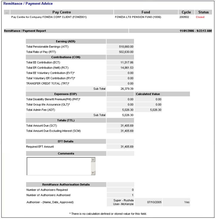 This report displays the actual remittance that was calculated. It contains the totals of the contributions, the expenses and any other related information for the payment to the administrator.