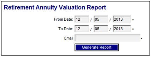 Click New below Retirement Annuity Valuation. The Retirement Annuity Valuation Report screen will be displayed.