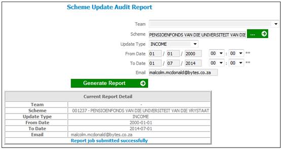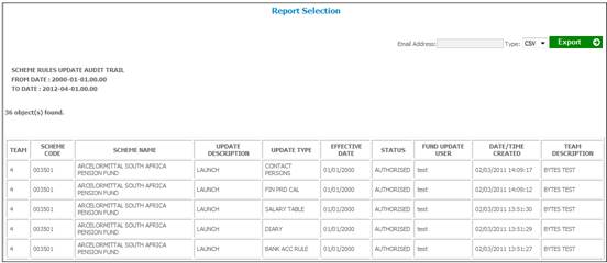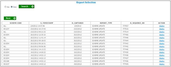 When the Generate Report button is selected, the system will read the Scheme Update records and find the records with a Timestamp greater than and equal to the From Date captured and less than or equal to the To Date.