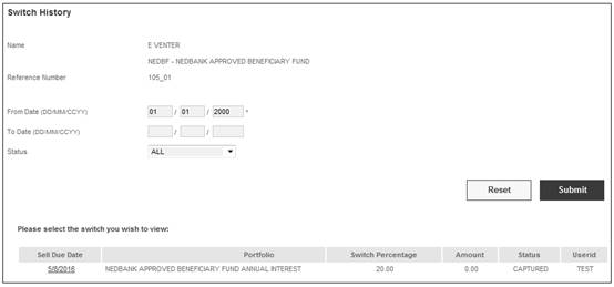 You can view details of the switch for each of the switch transactions. Click the hyperlinked date in the Sell Due Date column. The Switch History screen will be displayed on the lower portion of the screen for the selected transaction.
