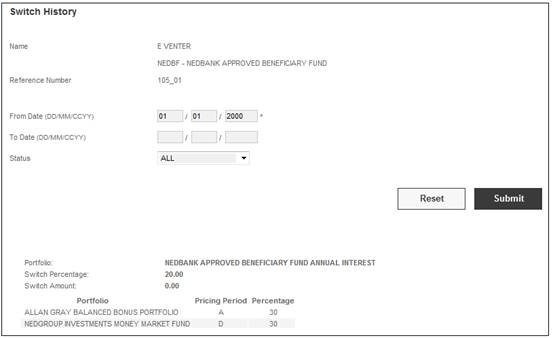 The Investment Switches information will be shown on the lower portion of the screen.